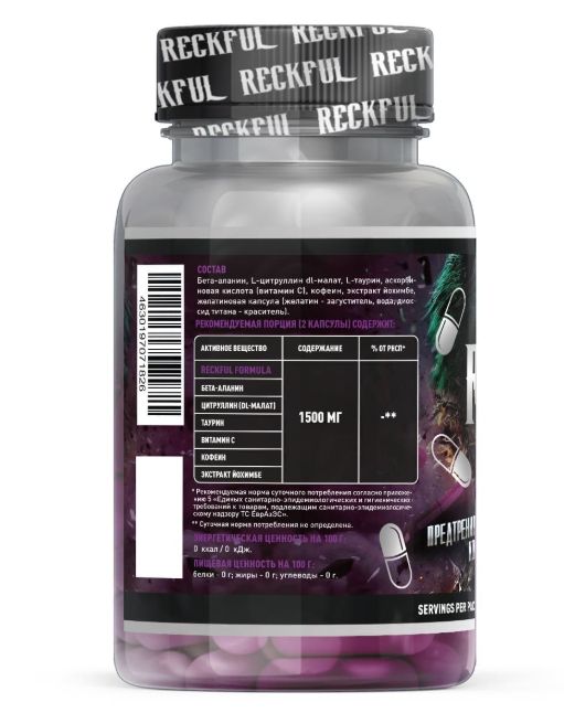 2SN RECKFUL pre-work не содержит в своем составе креатин, поэтому может быть использован при жиросжигающих диетах и сушке, так как не будет провоцировать задержку жидкости в организме.