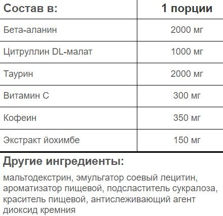 Наличие цитруллин малата обеспечит мощный пампинг и транспорт к мышцам большого количества кислорода и питательных веществ. Таурин усилит действие стимуляторов. Бета-аланин снизить уровень молочной кислоты, что позволит мышцам делать больше повторений, отсрочиваю момент отказа.