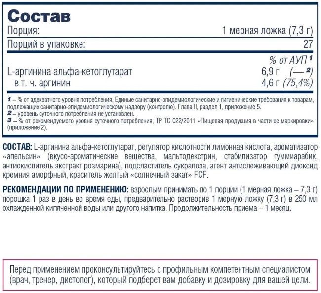 Кроме эффективной формы аргинина добавка содержит только вкусовые компоненты, улучшающие ее вкус. Никаких потенциально опасных веществ добавка не включает в себя, в том числе в ней нет сомнительных подсластителей, таких как аспартам.