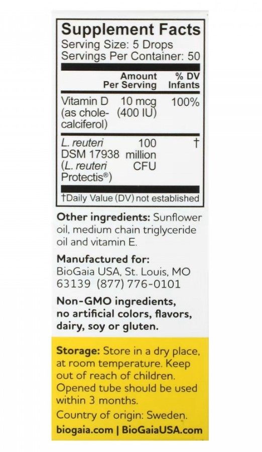 БиоГая пробиотик. Детские капли BioGaia Probiotic drops for baby содержат содержат молочнокислые бактерии Lactobacillus reuteri DSM 17938 (L. reuteri Protectis trade;).L. reuteri Protectis способствуют восстановлению микрофлоры кишечника: