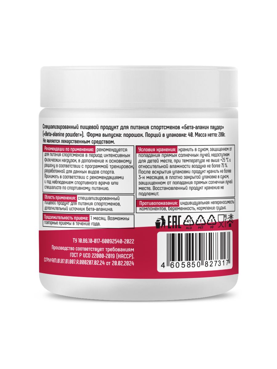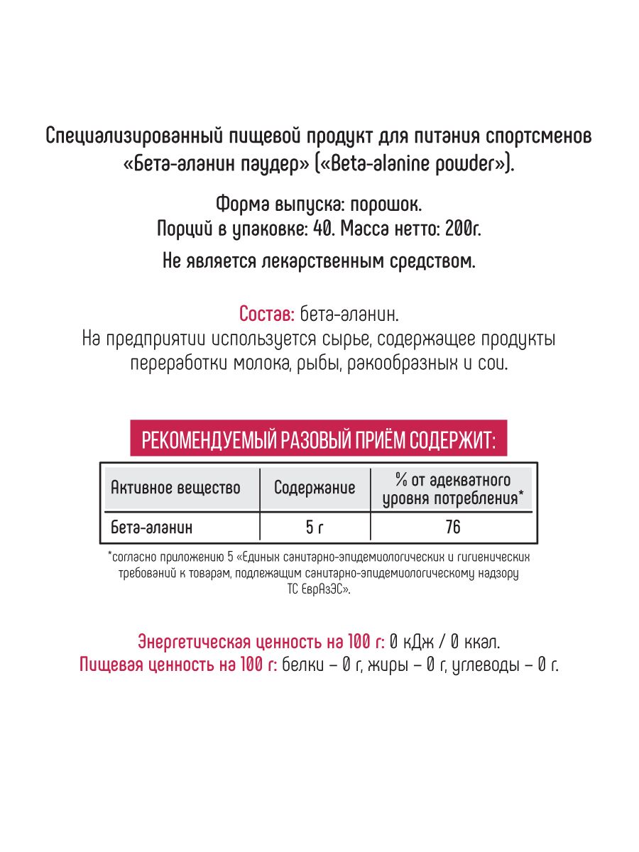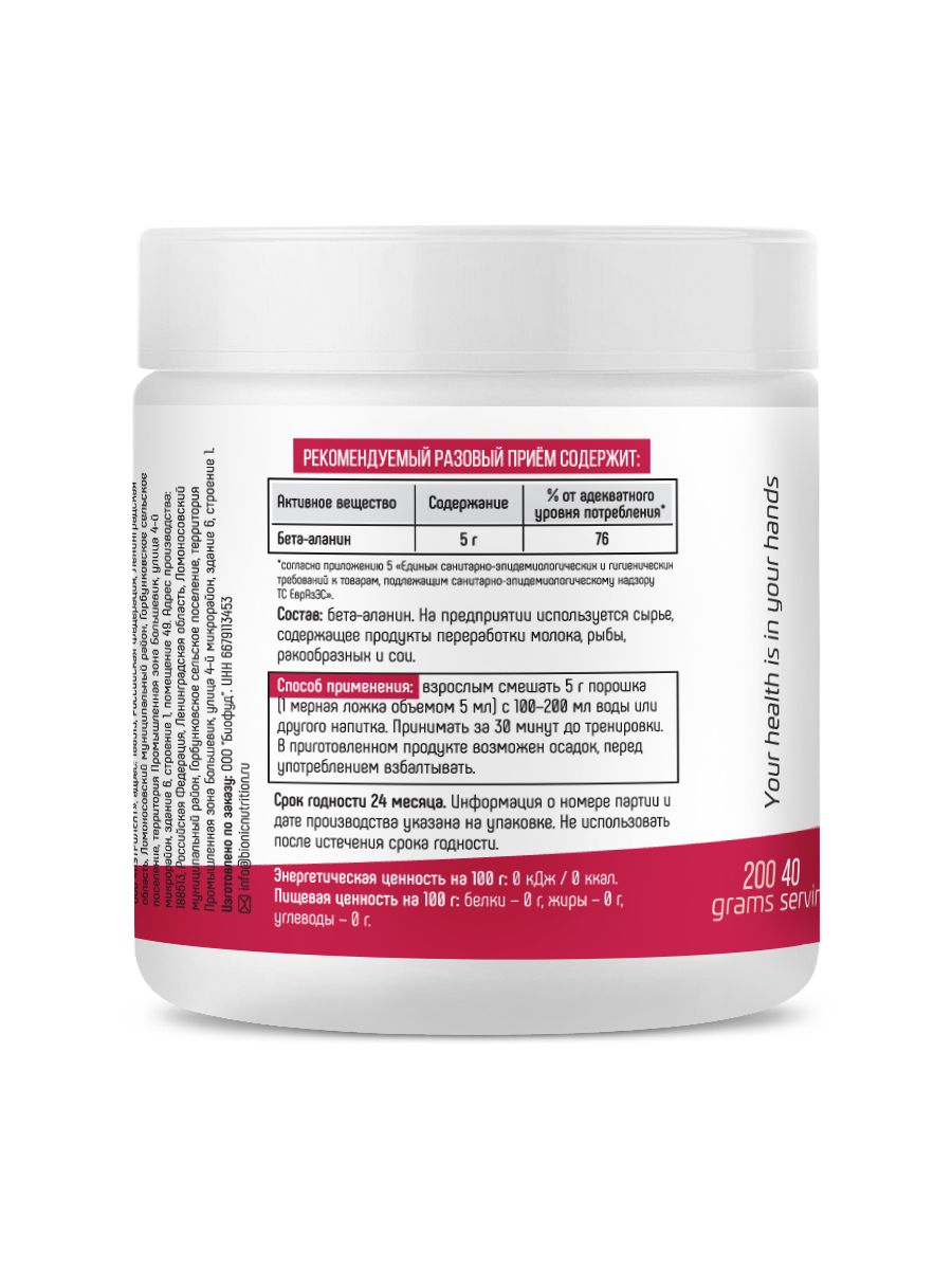 Одна мерная ложка Bionic Beta-Alanine Powder поставляет 1,6 грамма чистого бета-аланина, а также 550 мг гистидина и 160 мг соединений, поставляющих фосфатную группу.