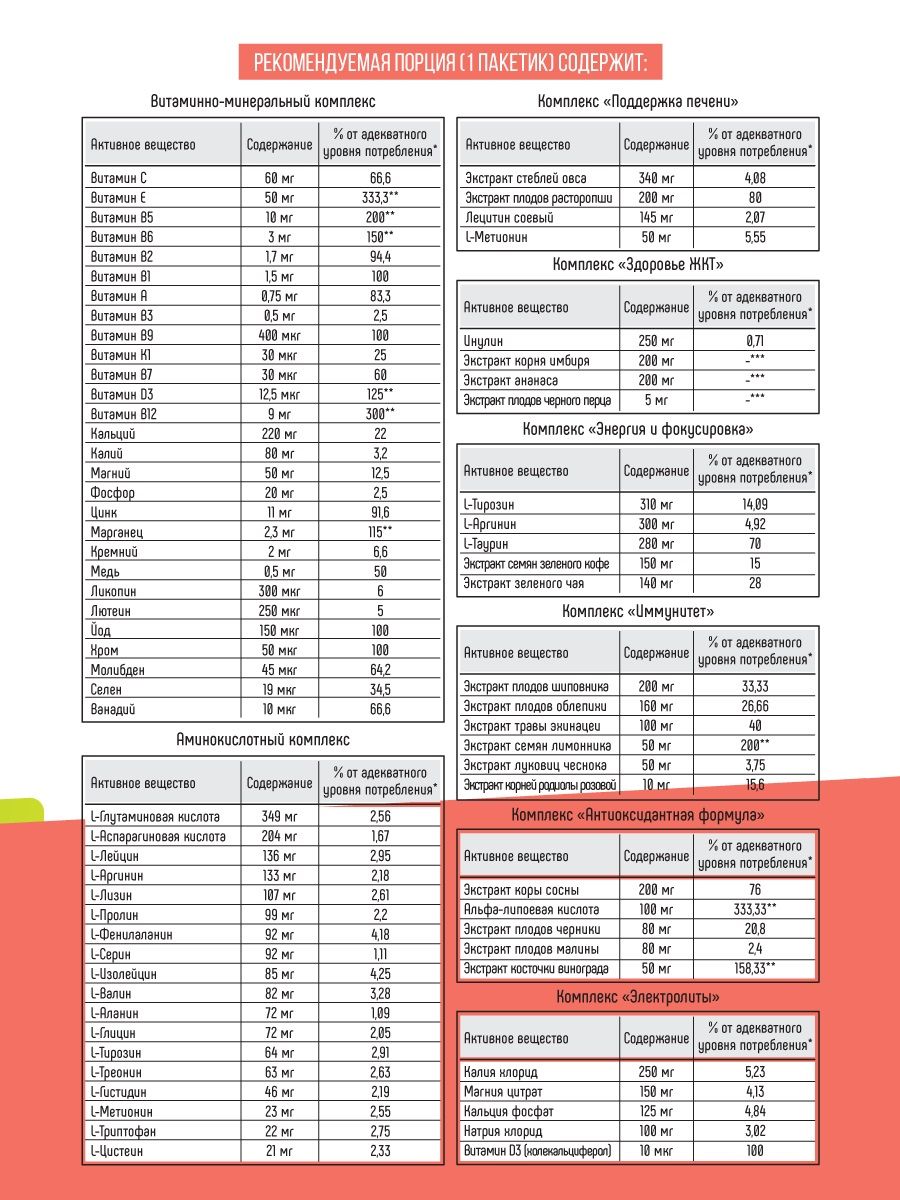 Компоненты комплекса подобраны для полного обеспечения повышенных потребностей людей активного образа жизни. В состав включены не только минералы, витамины и аминокислоты, но и ряд уникальных компонентов, отсутствующих в подобных аналогах.