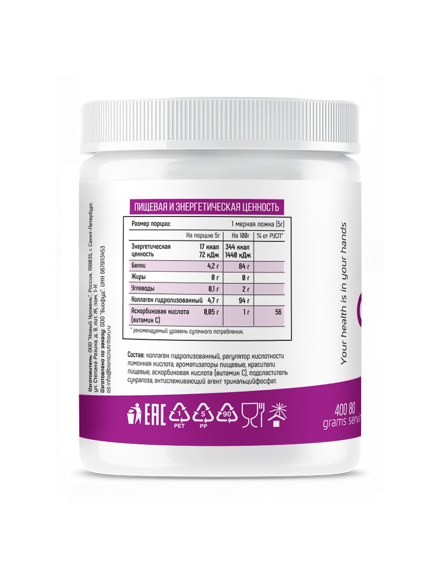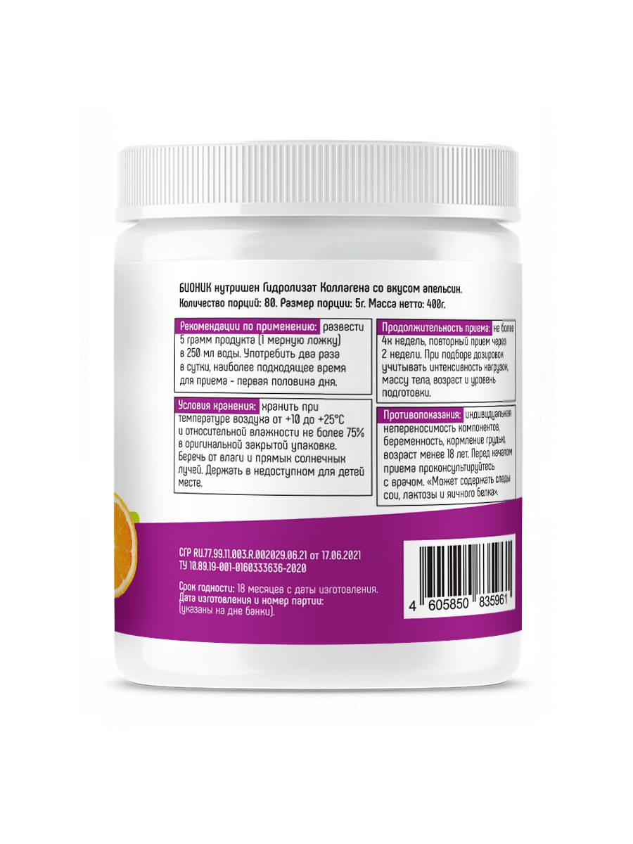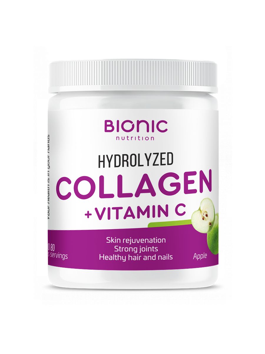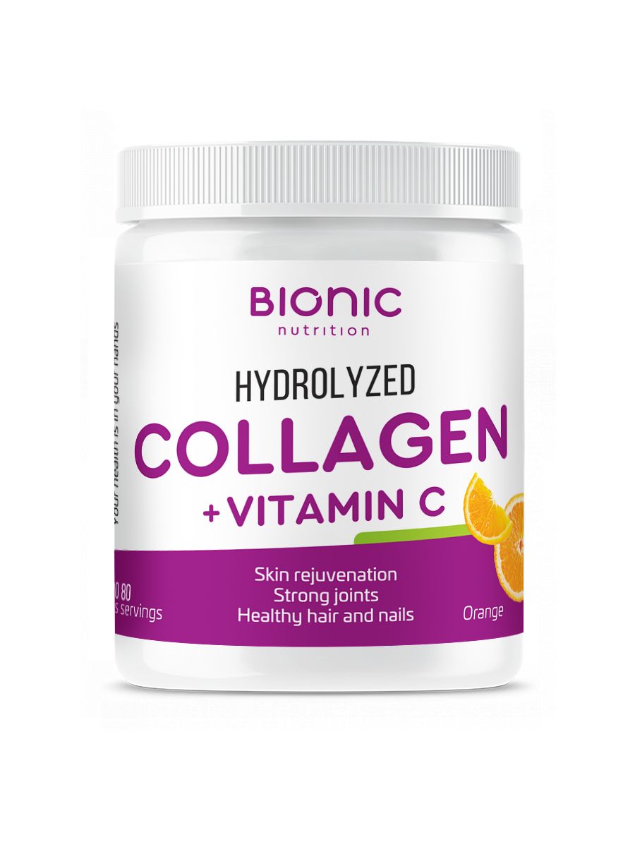 HYDROLYZED COLLAGEN от Bionic Nutrition-это пищевая добавка содержащая гидролизат коллагена в виде порошка с приятным цитрусовым вкусом.Дает вам гидролизат коллагена, который является натуральным компонентом кожи, коллаген предотвращает потерю упругости и эластичности кожи.Также в формуле присутствует витамин С, который способствует естественному образованию коллагена для нормального функционирования костей, хрящей и кожи. Продукт особо рекомендуется женщинам, которые заботятся о своей коже, а также активным людям, которые испытывают постоянные нагрузки на суставы и связки.