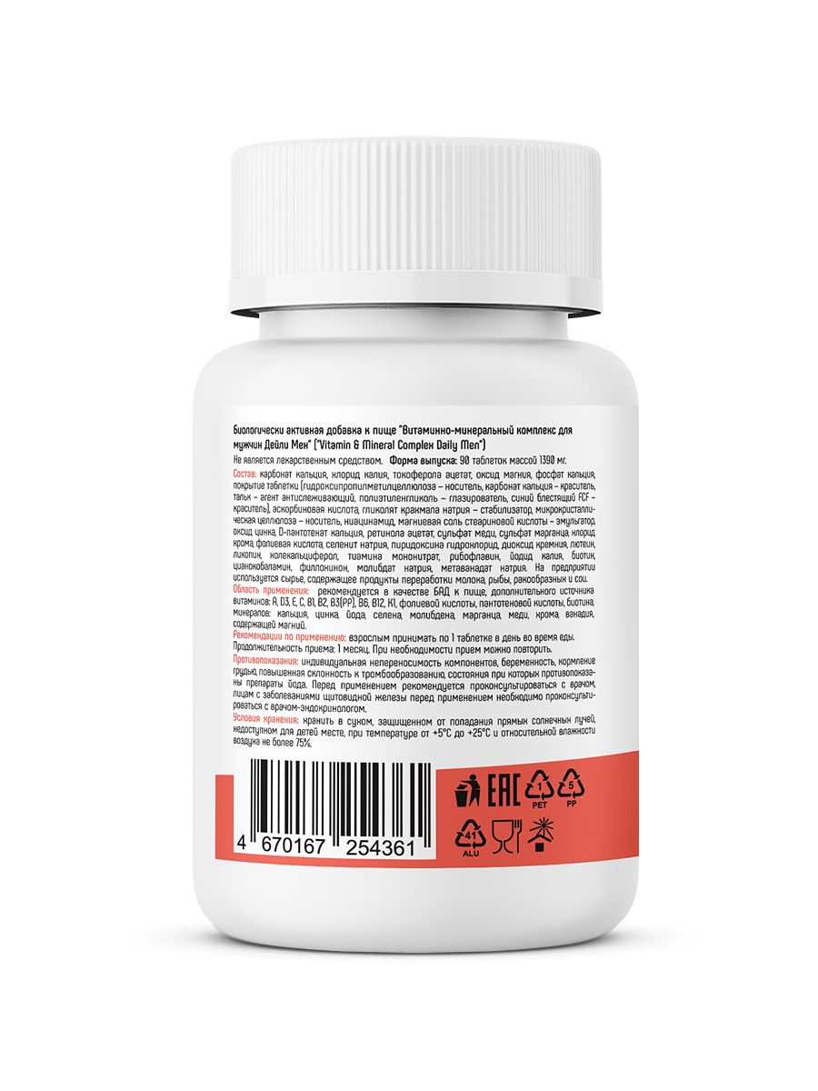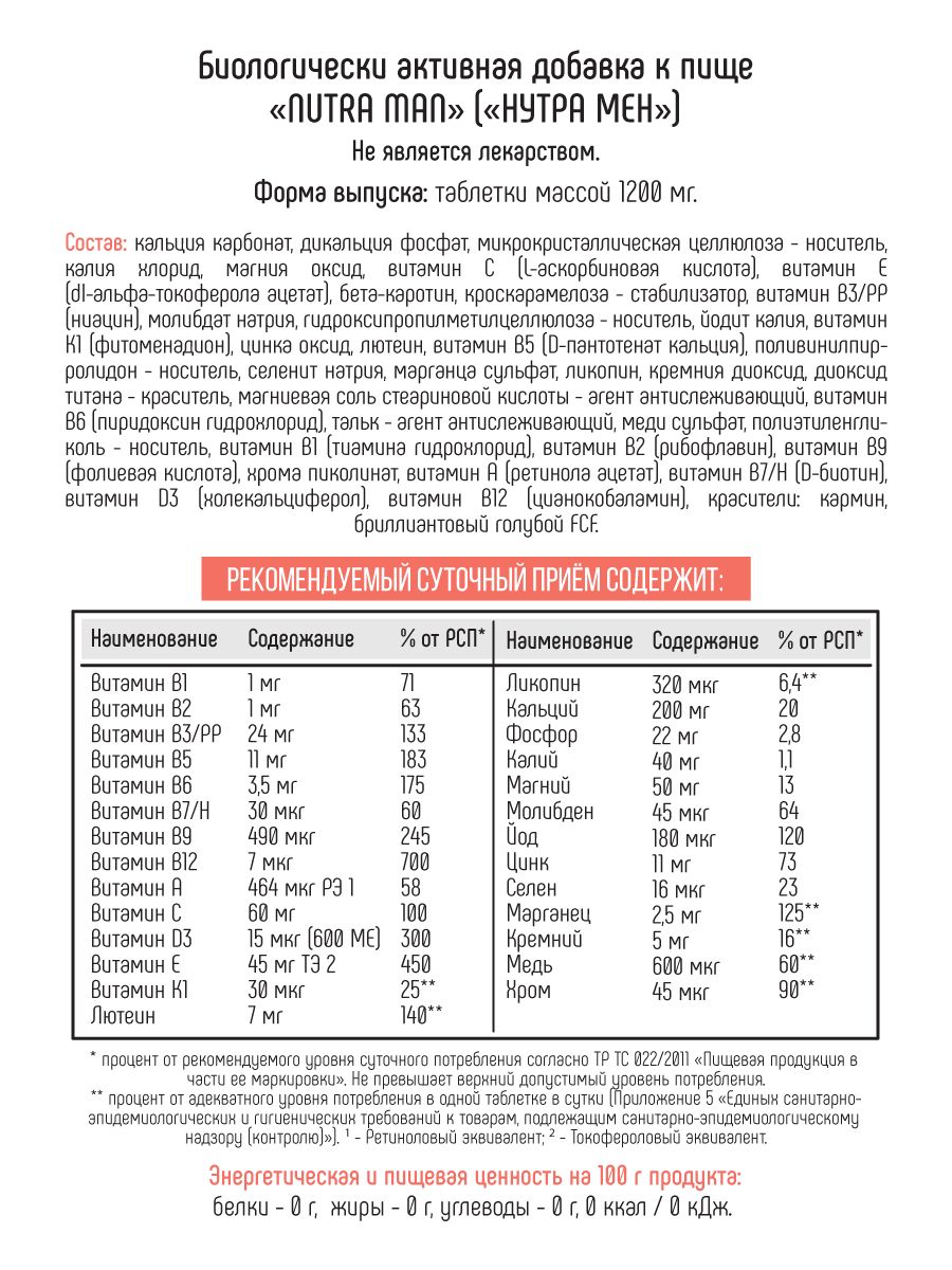 Состав (на порцию 1 таблетка): Витамин А - 860 мкг, Витамин С - 60 мг, Витамин Е - 45,45 мг, Витамин В1 - 1,5 мг, Витамин В2 - 1,7 мг, Ниацин (витамин РР) - 20 мг, Витамин В6 - 3 мг, Витамин В12 - 9 мкг, Витамин D3 - 12,5 мкг, Витамин К1 - 30 мкг, Фолиевая кислота - 400 мкг, Витамин В5 - 10 мг, Биотин - 30 мкг, Кальций - 245 мг, Магний - 50 мг, Цинк - 11 мг, Йод - 150 мкг, Селен - 19 мкг, Молибден - 45 мкг, Марганец - 2,3 мг, Медь - 0,5 мг, Хром - 50 мкг, Ванадий - 10 мкг, Калий - 80 мг, Фосфор - 20 мг, Кремний - 2 мг, Лютеин - 0,25 мг, Ликопин - 0,3 мг