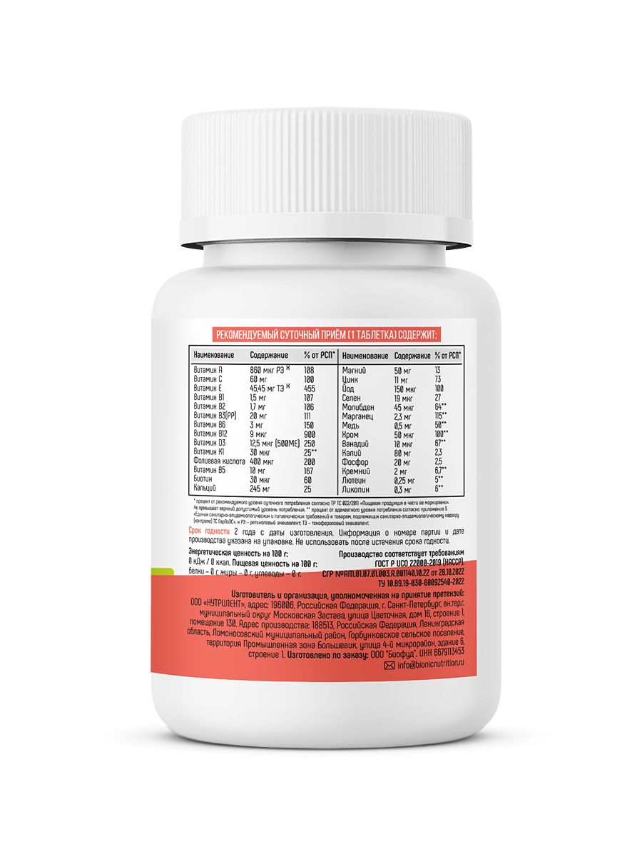 Ингредиенты: кальция карбонат, калия фосфат, натрия фосфат, магния оксид, витамин С (аскорбиновая кислота), витамин Е (Д-альфа токоферола ацетат), витамин PP (ниацин), цинка оксид, пантотеновая кислота, (D-кальция пантотенат), калия йодид, марганца сульфат, натрия мобибдат, кремния диоксид, витамин B6 (пиридоксина гидрохлорид), витамин B2 (рибофлавин), витамин B1 (тиамина мононитрат), меди сульфат, селенометионин, витамин A (ретинола ацетат, бета-каротин), хрома пиколинат, фолиевая кислота, ликопин, лютеин, ванадия аспартат, витамин K1 (фитоменадион), биотин, витамин D3 (холекальциферол), витамин B12 (цианокобаламин), эмульгатор микрокристаллическая целлюлоза, оболочка таблетки (эмульгатор, гидроксипропилметилцеллюлоза, агент влагоудерживающий поливиниловый спирт, стабилизатор полиэтиленгликоль, краситель диоксид титана, стабилизатор полидекстроза, агент антислеживающий тальк, эмульгатор стеарат магния, стабилизатор кроскарамеллоза.