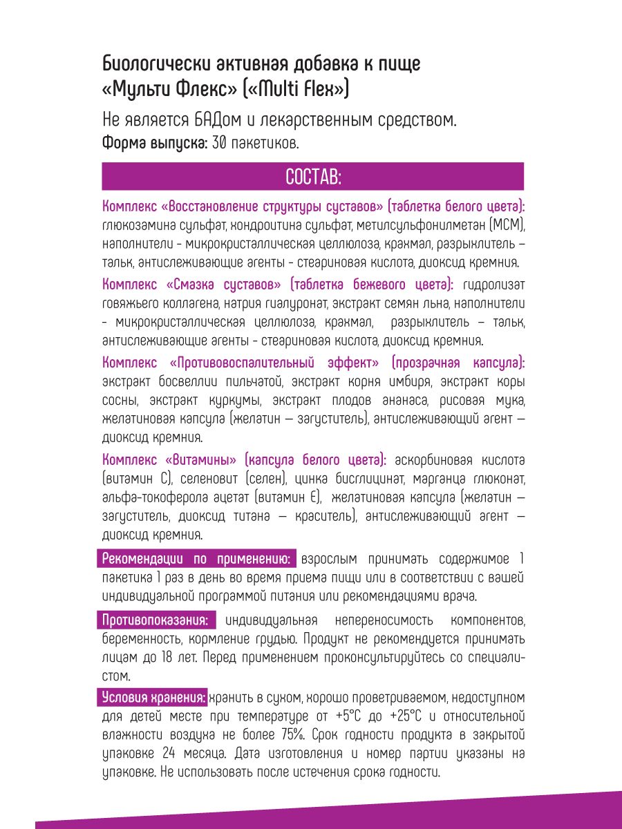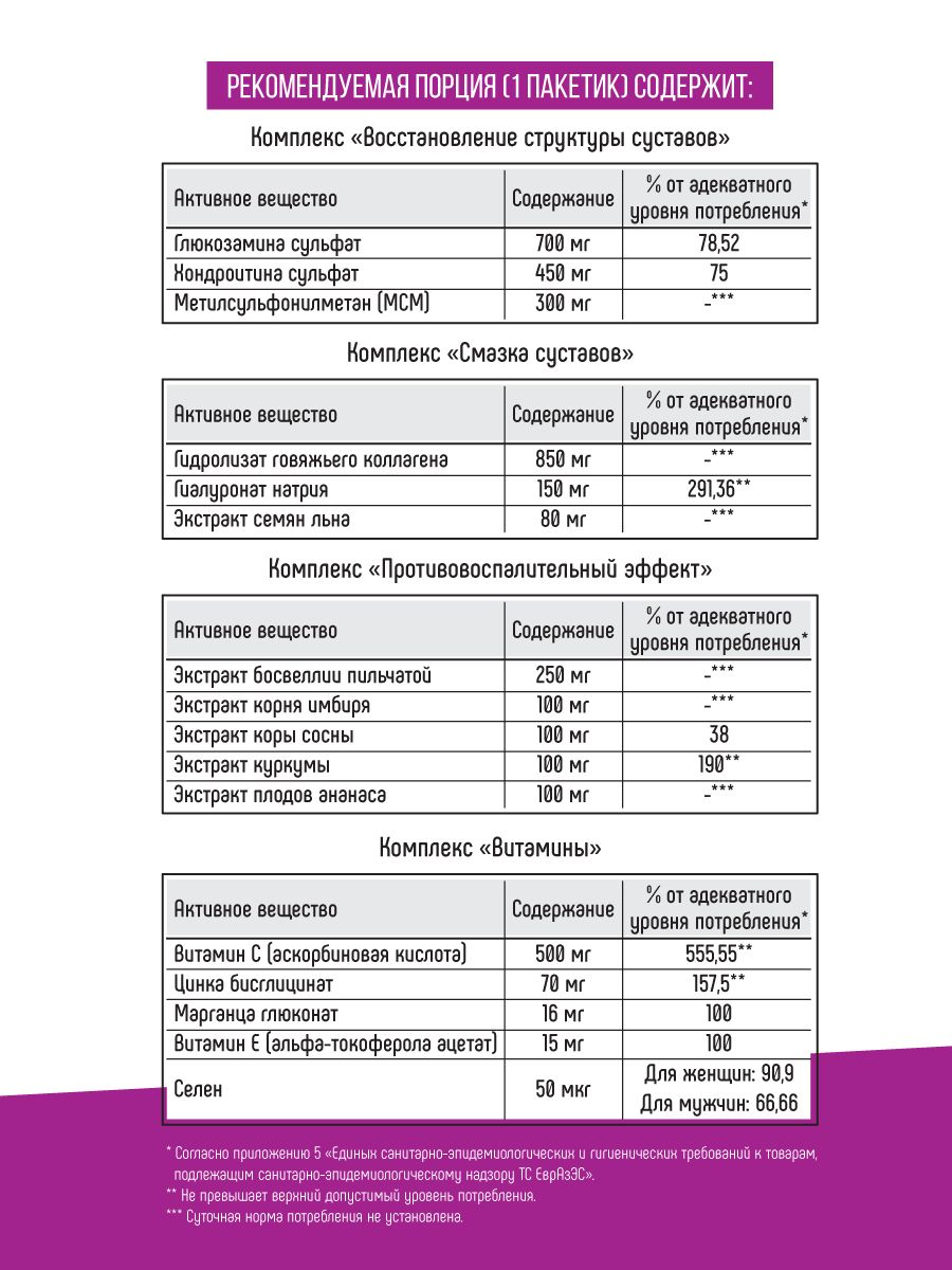 Flex Joint является незаменимым продуктом для для каждого человека, который хочет поддержать здоровье костей, суставов и связок. Уникальная формула сочетает глюкозамин, хондроитин и МСМ, которые играют ведущую роль в формировании связок и предотвращают их разрушение. Основой продукта являются гидролизованные пептиды коллагена -основной компонент всех тканей человека, включая связки, кости, кожу и внутренние органы. Витамин С повышает усвояемость и помогает повысить эффективность активных ингредиентов.