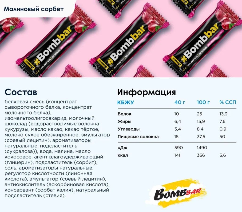 Протеиновый батончик Bombbar в шоколаде без сахара – он собрал в себе всё самое лучшее. Большое количество белка - целых 10 грамм. Небольшой вес и размер: батончик весит 40 грамм. Теперь его легче съесть (если ты не справлялась с 60и граммовым) и легче взять с собой. Покрыт натуральным шоколадом без сахара нашего собственного производства: настоящее какао-масло, натуральный подсластитель, отсутствие сахара и вредных масел. Только самые качественные европейские ингредиенты и максимальный контроль производственного процесса. Это – твой Бомббар.