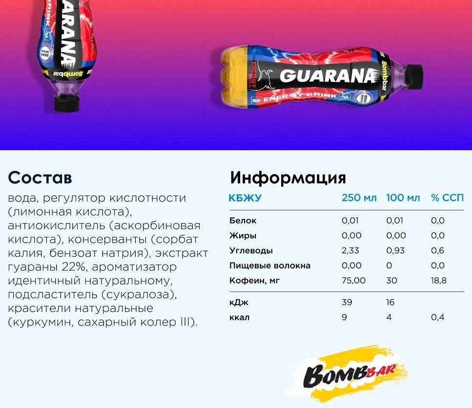 Bombbar Guarana - вдохновленный динамикой современной жизни, этот энергетик без сахара с гуараной представляет собой идеальное сочетание освежающего вкуса, бодрящей энергии и заботы о здоровье.