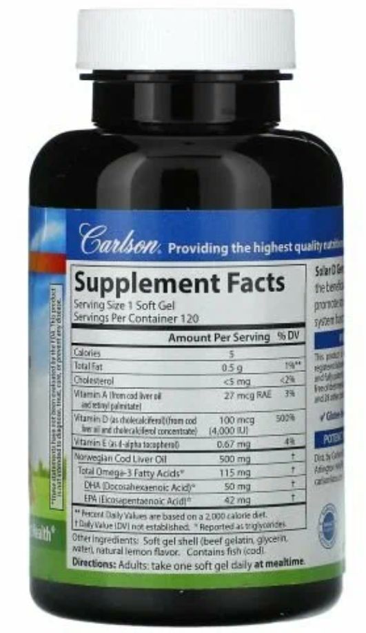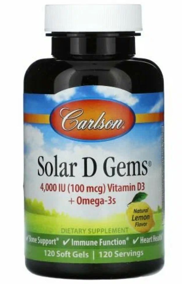 Carlson, Solar D Gems, Витамин D3 (4000 МЕ)+ Омега-3s, 120 мягких таблеток (натуральный лимон)