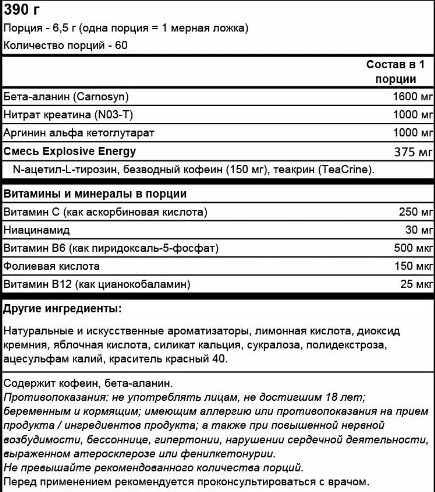 C4 от компании Cellucor - это эффективный предтренировочный комплекс. Уникальный состав предтренировочного комплекса C4 включает в себя: нитрат креатина, что является источником энергии для мышц, помогает справиться с повышенными физическими нагрузками; бета-аланин - аминокислота, предотвращает закисление мышц во время тренировок; N-Ацетил L-тирозин - поддерживает умственную и физическую работоспособность, усиливает мотивацию; кофеин - стимулирует работу нервной системы и выработку энергии, благодаря чему не чувствуется усталость и повышается концентрация. Употребление C4 поможет максимально повысить эффективность и интенсивность тренировок. Продукт содержит кофеин, бета-аланин. Не употреблять лицам, не достигшим 18 лет, беременным и кормящим, имеющим аллергию или противопоказания на прием продукта / ингредиентов продукта. Не превышайте рекомендованного количества порций.