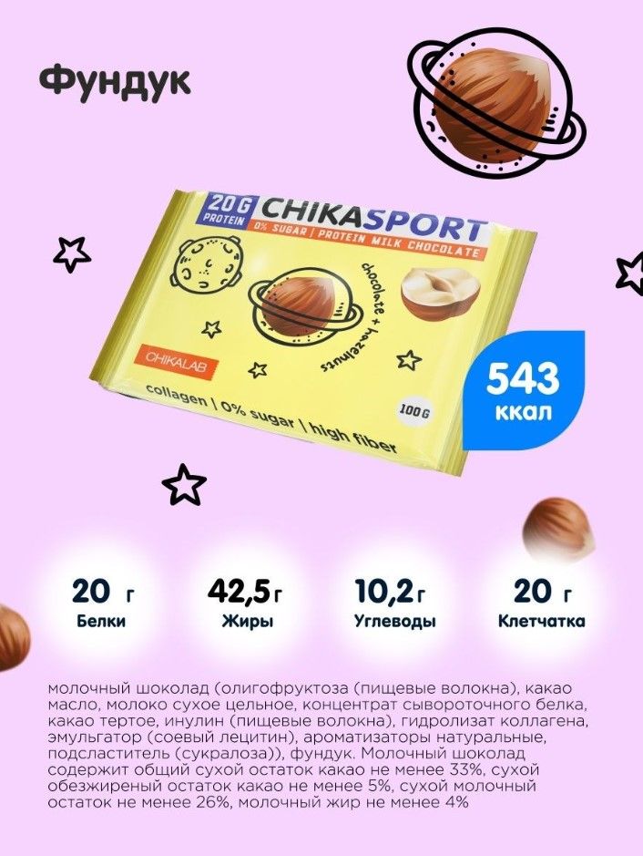 Шоколад CHIKALAB может стать достойной заменой привычным десертам из магазина. Во вкусе продукта ощущается любимая всеми молочная нотка. Чтобы каждый перекус отличался от предыдущего, CHIKALAB выпускает его в четырёх вкусах- классическим молочным, молочном с фундуком, молочном с кешью и молочном с миндалём. Сахара в шоколаде нет. Вместо него в продукции в качестве подсластителя используется кукурузное волокно и сукралоза. Кукурузное волокно- это пищевое волокно. Сладкая клетчатка, которая укрепляет кости. Эти продукты не только хорошо питают, но и благодаря им можно получить необходимое количество клетчатки для заботы о здоровье.