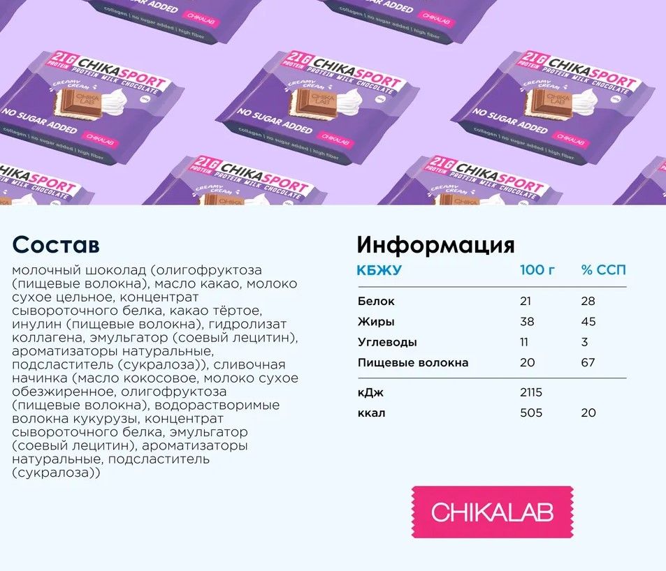 В составе шоколада Chikalab также осталась большая порция белка, на одну плитку 100г выходит 21 гр. белка ( жир 38г, углевод 11г - на одну порцию шоколада 100 гр. 505 ккал).