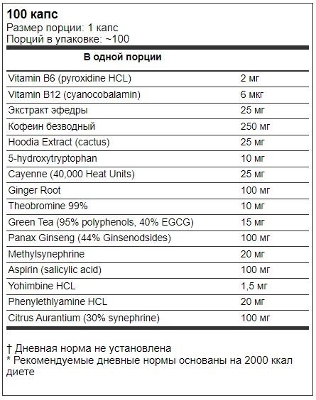 Способ применения: принимайте по 1 таблетке во время завтрака и обеда (перед тренировкой). Максимальная дозировка - 2 капсулы в сутки. Внимание! Указанную дозировку не превышать.