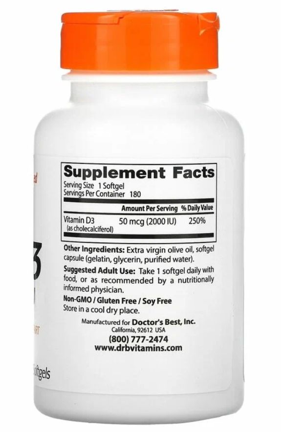 Doctor's Best Vitamin D3 2000 IU — это добавка, содержащая 2000 международных единиц витамина D3, которая поддерживает здоровье и функциональность организма на множестве уровней. Витамин D3, также известный как холекальциферол, является активной формой витамина D, которая играет ключевую роль в поддержании крепких костей, оптимальной функции иммунной системы и общего благополучия.