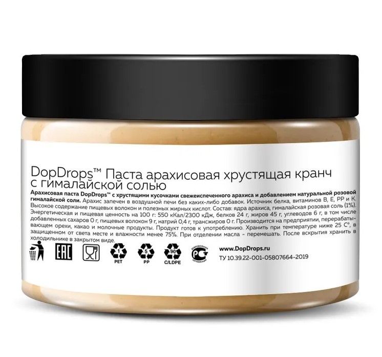Хрустящие кусочки арахиса и нежный солоноватый вкус Арахисовай Пасты DopDrops послужат прекрасным дополнением к завтраку, овощным и мясным блюдам. Специальная рецептура запечения арахиса DopDrops позволяет раскрыть аромат и вкус этого продукта, сохраняя его полезные свойства.