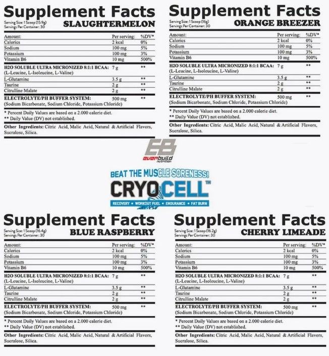 Cryo Cell от Everbuild - это синергетическая композиционная формула, которая содержит наиболее важные активные ингредиенты, ответственные за восстановление, выносливость и энергию в организме человека. Основными веществами в комплексе являются ультрамикронизированные, растворимые в воде аминокислоты с разветвленной цепью 8:1:1. Он также обогащен электролитами, жизненно важными для оптимальной гидратации организма.