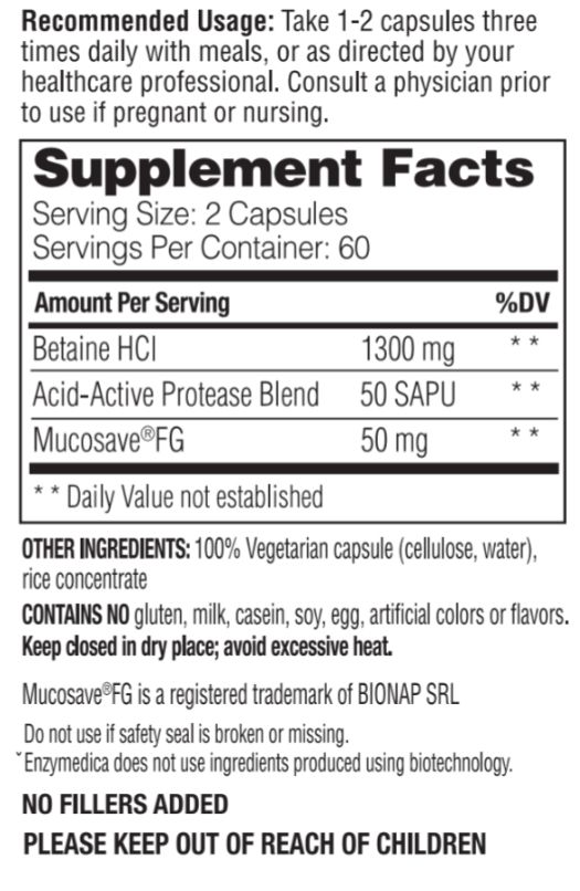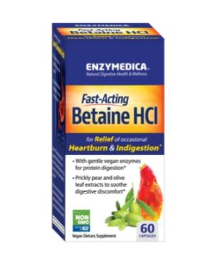 Enzymedica Betaine HCL — это добавка, содержащая бетаин гидрохлорид, которая поддерживает нормальный уровень кислоты в желудке и улучшает пищеварение.