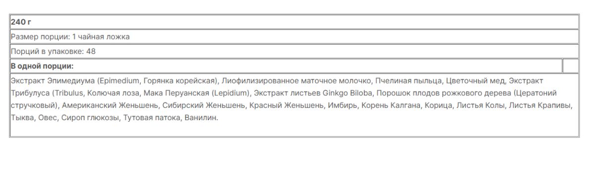 Эпимедиумная паста содержит в составе: Экстракт Эпимедиума (Epimedium, Горянка корейская), Лиофилизированное Маточное молочко, Пчелиная пыльца, Цветочный мед, Экстракт Трибулуса (Tribulus, Колючая лоза), Мака Перуанская (Lepidium), Экстракт листьев Гинкго Билоба (Ginkgo Biloba), Порошок плодов Рожкового дерева (Цератоний стручковый), Американский Женьшень, Сибирский Женьшень, Красный Женьшень, Имбирь, Корень Калгана, Корица, Листья Колы, Листья Крапивы, Тыква и т.д.