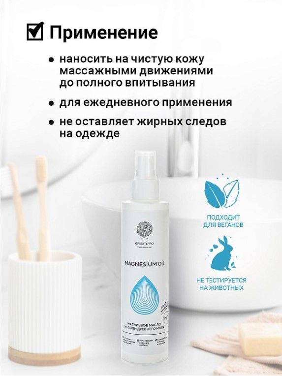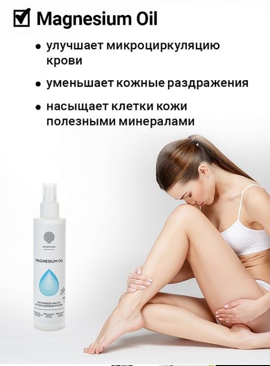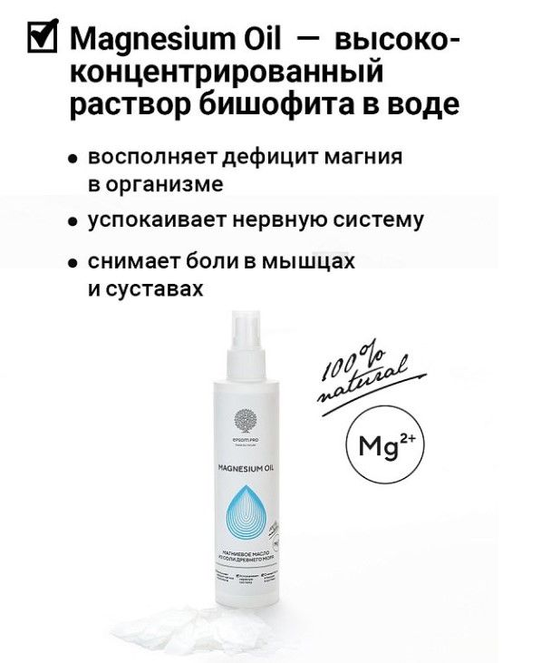Ежедневное применение магниевого масла – наиболее эффективный, быстрый и безопасный способ восполнить дефицит магния в организме. Этот элемент участвует в более чем 300 биохимических реакциях и играет большую роль в работе нервной, сердечно-сосудистой, костно-мышечной систем. Масло содержит раствор солей магния в высокой концентрации, без отдушек и добавок.