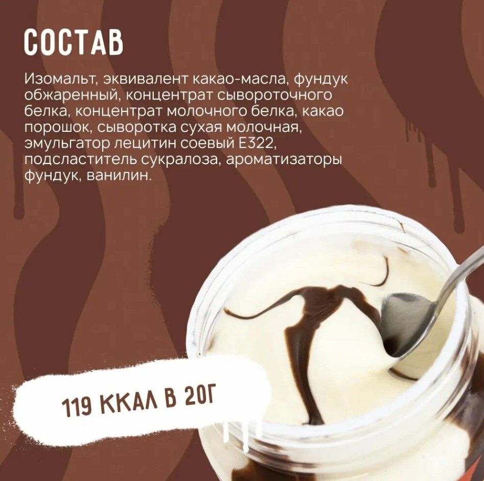 Ингредиенты: Изомальт, эквивалент какао-масло, фундук обжаренный, концентрат сывороточного белка, концентрат молочного белка, какао порошок, сыворотка сухая молочная, эмульгатор лецитин соевый (Е322), подсластитель сукралоза, ароматизаторы фундук, ванилин.