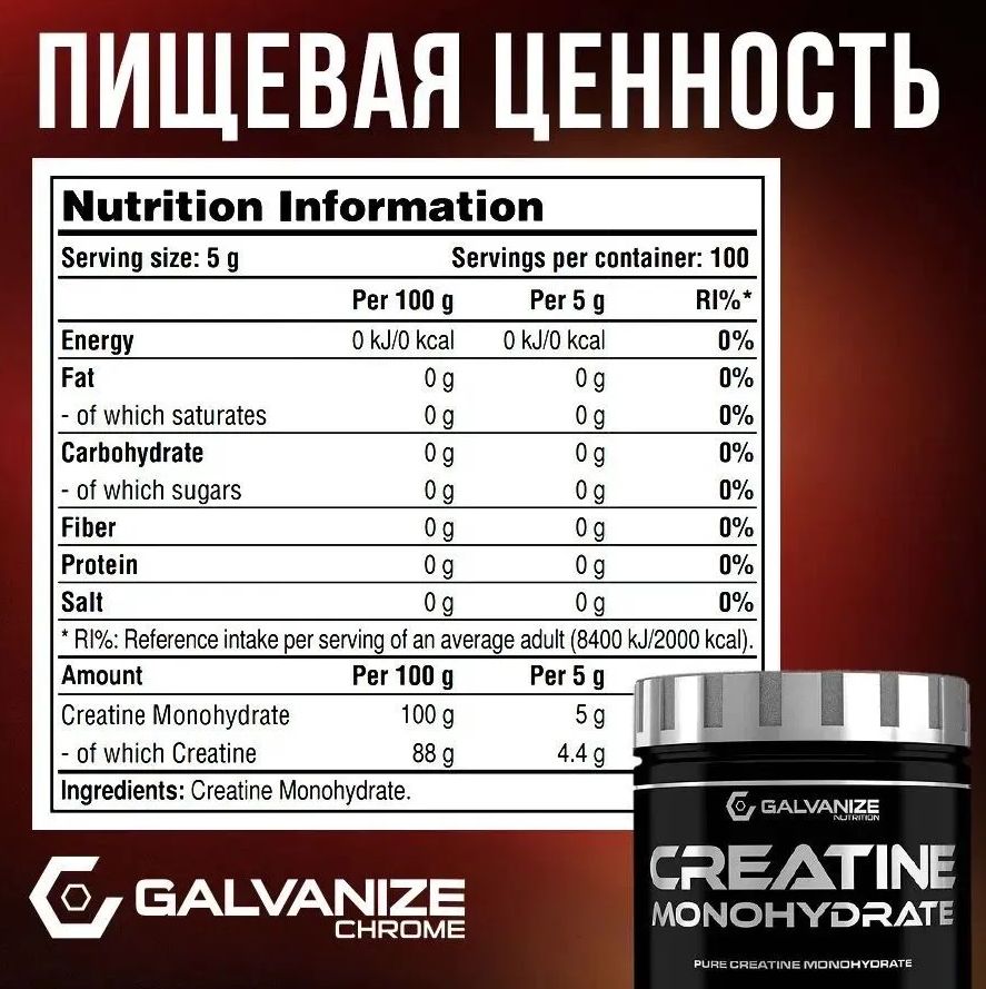 Креатин от Galvanize Nutrition – это органическое соединение, участвующее в обеспечении энергией мышц. Потребность в нем возрастает при интенсивных физических нагрузках, когда может не хватить выносливости для выполнения поставленной задачи. Креатин моногидрат — это самая распространенная и исследованная форма креатина, который используется как добавка для повышения физической производительности, особенно в видах спорта, требующих высокой интенсивности и коротких всплесков энергии, таких как спринт, тяжелая атлетика и некоторые виды командных игр. Также используется при любых других видах физической активности, где требуется повышенная выносливость. Польза от приема Galvanize Nutrition Creatine Monohydrate: 1. Повышение выносливости и силовых показателей. Креатин помогает увеличить запасы фосфокреатина в мышцах, что позволяет дольше поддерживать высокую интенсивность тренировок. 2. Увеличение мышц. Креатин способствует задержке воды в мышцах, что визуально увеличивает их объем. 3. Улучшение работы мозга. Креатин участвует в энергетическом обмене в нервных клетках, что положительно сказывается на когнитивных функциях. 4. Поддержание здоровья сердечно-сосудистой системы. Креатин помогает сердечной мышце более эффективно использовать энергию. 5. Ускорение восстановления после тренировок. Креатин способствует сокращению времени рекуперации мышц. Креатин моногидрат – это безопасная добавка, при умеренном и правильном применении она не имеет побочных эффектов.