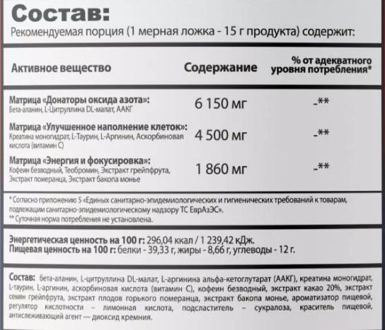 MESOMORPH от HellLabs - уникальный предтренировочный комплекс с полноценными рабочими дозировками всех ингредиентов. За это Мезоморф называют "царём предтреников". Состав Mesomorph - это только самые крутые ингредиенты: Креатин-нитрат (новейшая форма креатина); Бета-аланин; Креатинол-о-фосфат; Цитруллин малат; Аргинин Альфа Кетоглутарат (ААКГ); L-таурин; Агматин сульфат Mesomorph, подобно аргинину, стимулирует производство оксида азота, ускоряя кровоток и транспорт питательных веществ и кислорода в мышцах. При употреблении Mesomorph вы каждый раз сможете откладывать момент, когда больше невозможно тренироваться из-за высокого уровня кислотности в мускулах при нарушении связи мышечных клеток с нервной системой. Таким образом вы сможете делать больше повторений упражнений, чем обычно, и мышцы будут расти быстрей. Эффекты Mesomorph от HellLabs: Мощный драйв на тренировках Высокая силовая выносливость и интенсивность тренировок До 4х раз больше активных веществ, чем у аналогов 4000 мг бета-аланина в каждой порции Одна из лучших энергетических формул в предтрениках Сумасшедший пампинг и прорисовка вен Эффективнейшая форма креатина — Креатин-нитрат Хорошая водорастворимость.