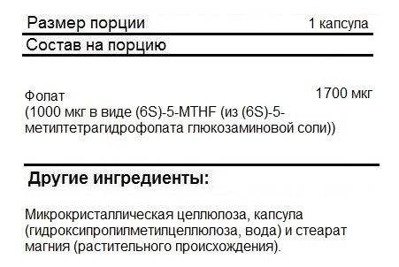 Фолат (5-метилтетрагидрофолат глюкозаминовая соль): 1000 мкг.