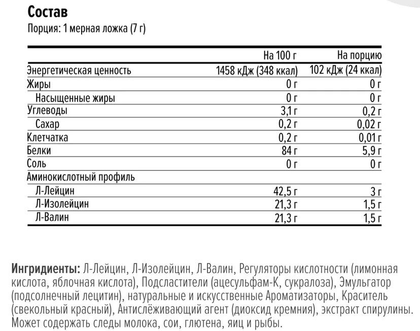 BCAA Powder – это аминокислоты с разветвленными цепями (БЦАА) в классическом соотношении 2:1:1 (L-Лейцин, L-Изолейцин, L-Валин) в форме порошка.