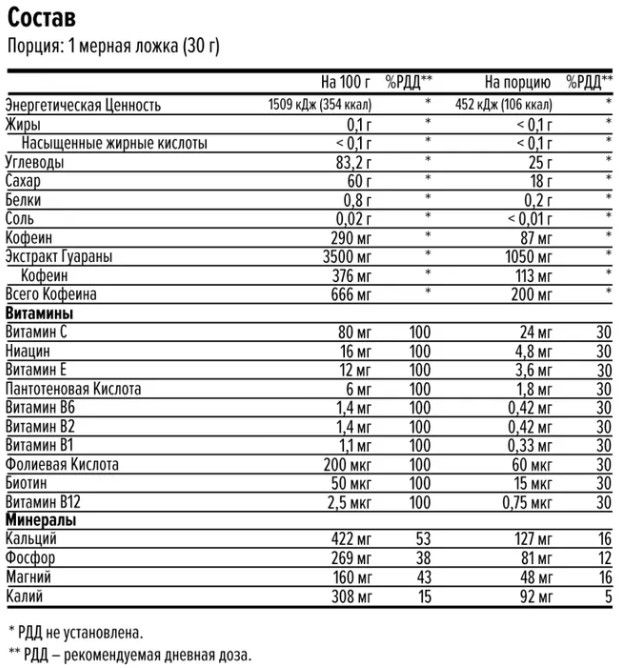 Для получения одной порции смешать 30 г порошка (1 мерную ложку) с 300 мл воды. Принимать за 30 минут до тренировки.