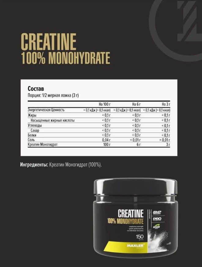 Creatine - это 100% креатин моногидрат в порошковой форме. Креатин моногидрат - это самая распространенная форма креатина. Такая форма имеет максимальное содержание креатина (88%), обладает стабильностью при хранении и термоустойчивостью, не имеет вкуса.