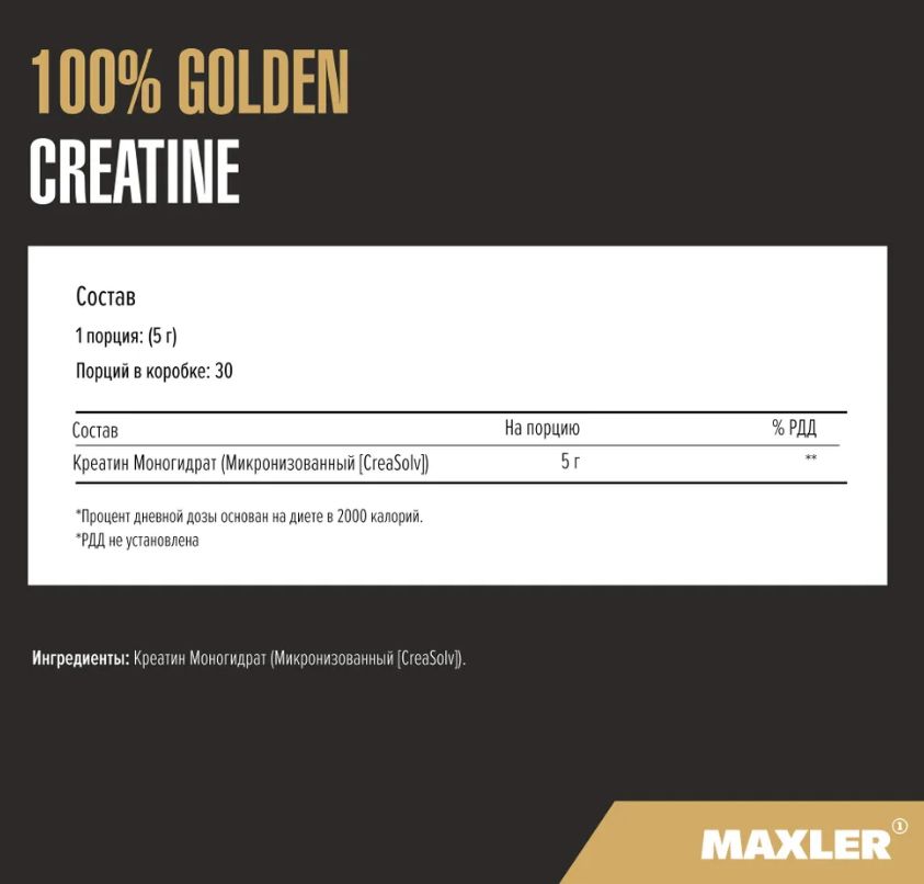 Maxler 100% Golden Creatine превосходит другие похожие продукты, так как благодаря микронизированной структуре мгновенно проникает в мышечные ткани, также он легко растворяется в воде. Все это делает 100% Golden Creatine идеальным продуктом для любого, кто занимается физической нагрузкой.