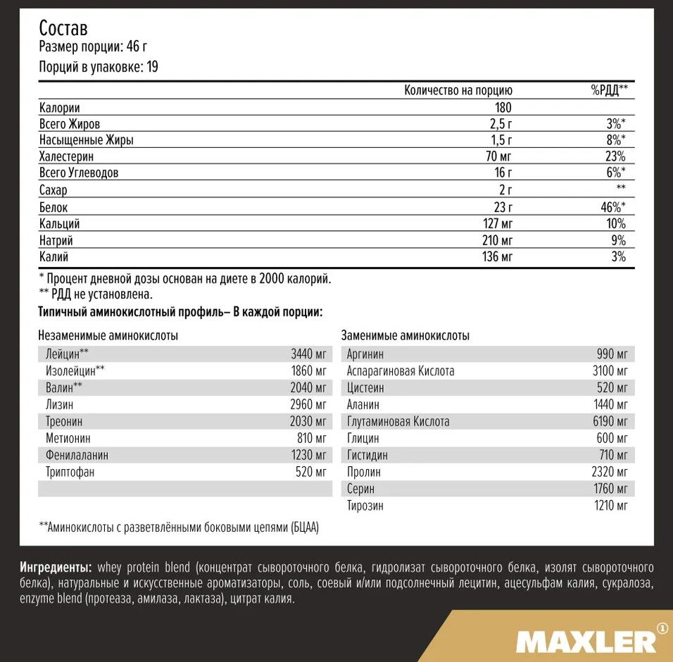 Maxler Golden 7 Protein Blend содержит различные источники белка, что позволяет обеспечить организм оптимальным количеством макроэлементов. Благодаря гидролизованным сывороточным белкам аминокислоты усваиваются быстрее, а казеиновая смесь поддерживает организм в течение нескольких часов после приёма протеина.