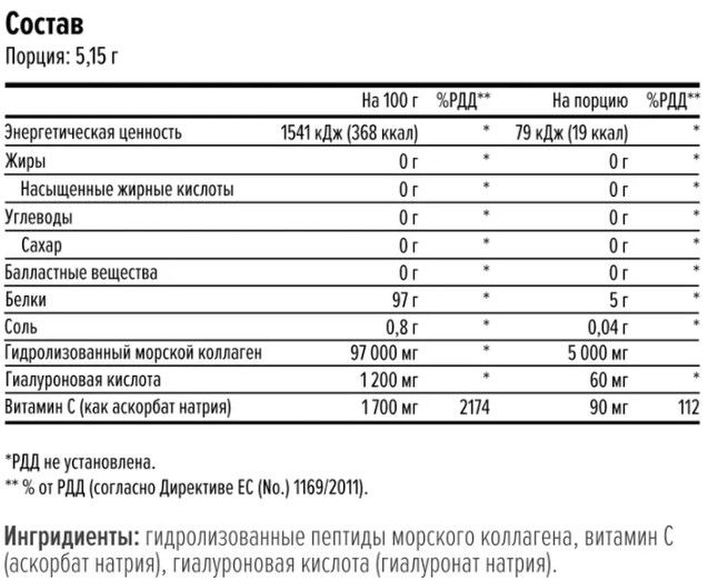Состав: гидролизованные пептиды морского коллагена, витамин С (аскорбат натрия), гиалуроновая кислота (гиалуронат натрия).