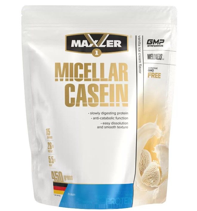 Многие спортсмены стремятся ускорить восстановление мышц и предотвратить их катаболизм во время сна. Именно в этих целях многие принимают казеин –медленно переваривающийся молочный протеин. Главное отличие казеина от сывороточного протеина заключается в том, что казеин усваивается намного дольше. Это значит, что он питает клетки аминокислотами на протяжении длительного периода времени. Многие исследования подтвердили, что казеин помогает ускорить рост мышечной массы, даёт чувство сытости и ускоряет восстановление после тренировок. Новый продукт от Макслер – Micellar Casein – имеет высокое содержание высококачественного протеина, а также БЦАА и Глутамина в каждой порции. Этот продукт производится из натуральных источников белка, имеет нежную кремовую текстуру и натуральный вкус.