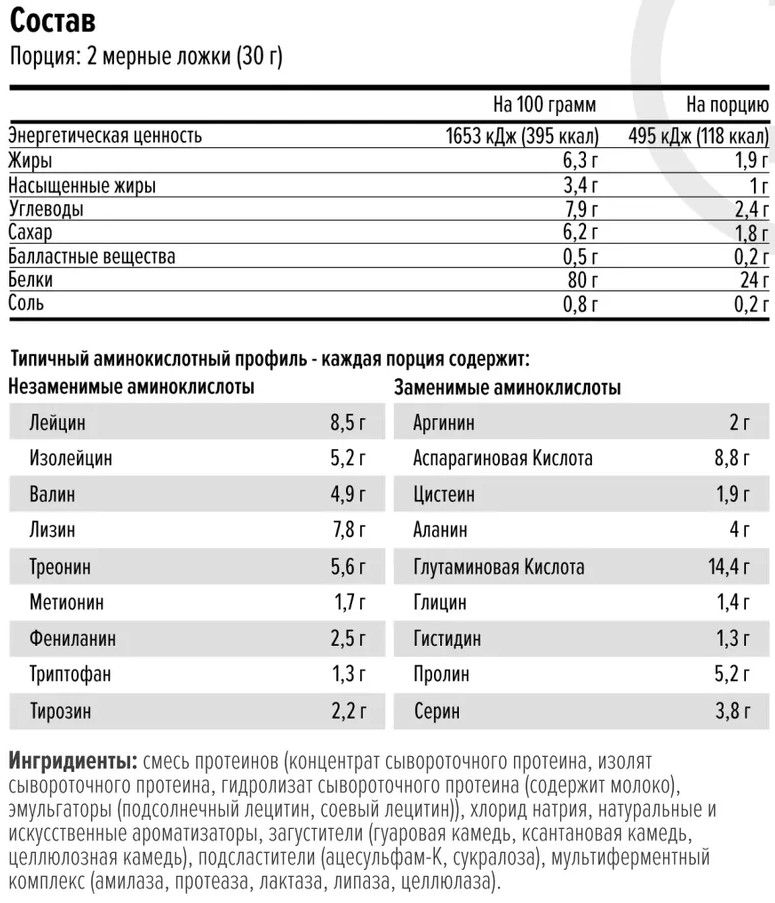После тяжёлых физических нагрузок мышцы нуждаются в восстановлении и поддержке. Для достижения данной цели необходим белок, поскольку он выполняет функцию основных строительных блоков человеческого организма. Протеин способствует увеличению роста мышц и улучшению восстановления мышечной ткани после интенсивных тренировок. Ultra Whey – это 80%ый сывороточный протеин высочайшего качества, который произведён из лучшего молока коров на свободном выпасе. Продукт отличается крайне низким содержанием жира и углеводов. Ultra Whey отлично смешивается, легко усваивается благодаря мультиэнзимному комплексу DigeZyme® и обладает удивительным натуральным вкусом. Ultra Whey замечательно подойдёт как для спортсменов и бодибилдеров, так и для активных людей, нуждающихся в натуральном белке высокого качества.