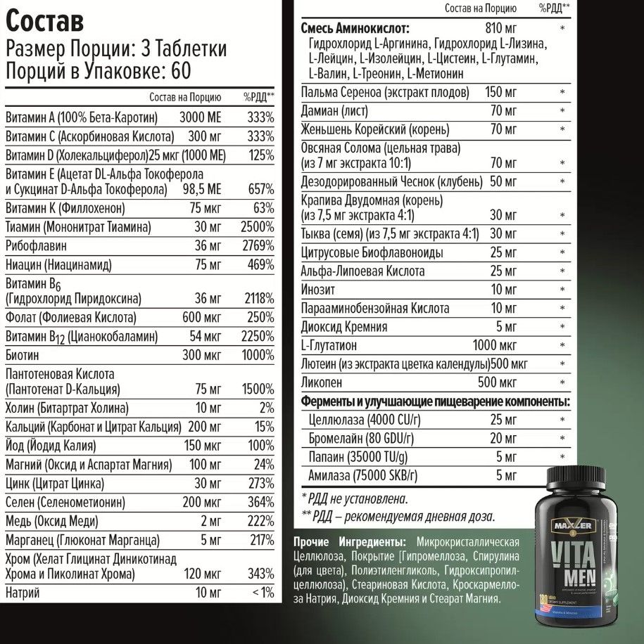 Vita Men Вита Мен, 90 таб Maxler - это комплекс, который создан специально для мужчин и включает комплекс ключевых минералов и экзотических фито-добавок VitaMen способствует улучшению умственной и физической активности, здоровью простаты, снижает негативные последствия стресса и нормализует функцию пищеварительной системы.