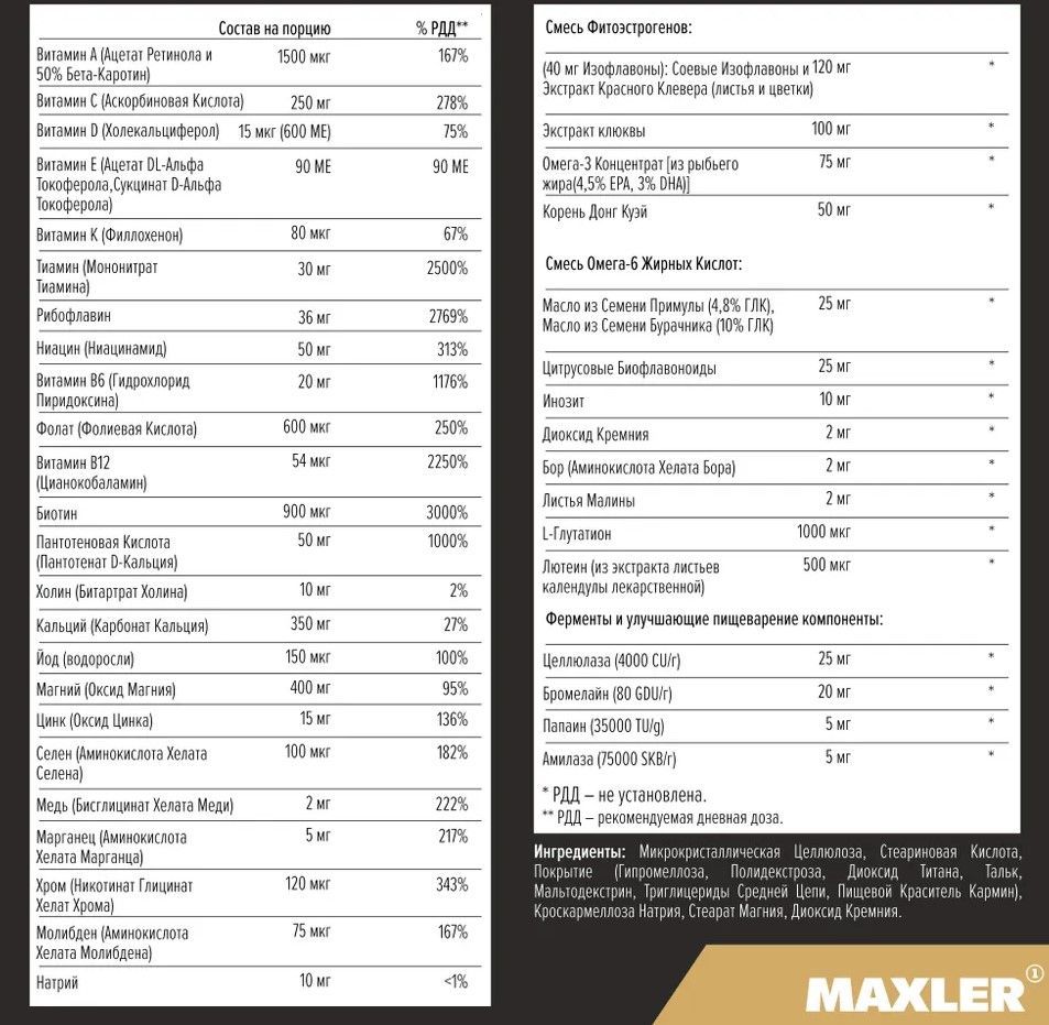 Витаминно-минеральный комплекс VitaWomen от Maxler разработан для женщин. В основе находятся необходимые для оптимальной работы всех систем женского организма витамины и минералы, а также компоненты с антиоксидантными свойствами и пищеварительные ферменты.