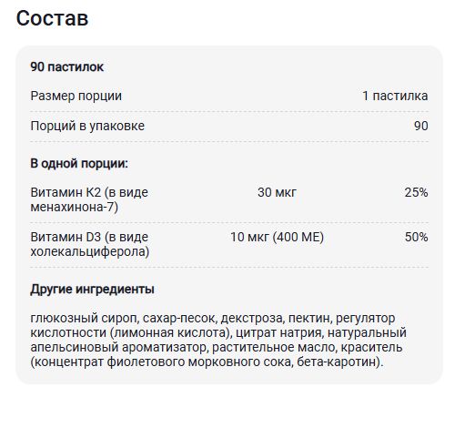 Для того чтобы витамин D3 мог лучше выполнять свою задачу, ему необходим витамин K2. Кальций имеет тенденцию откладываться на стенках кровеносных сосудов, уменьшая их проницаемость.