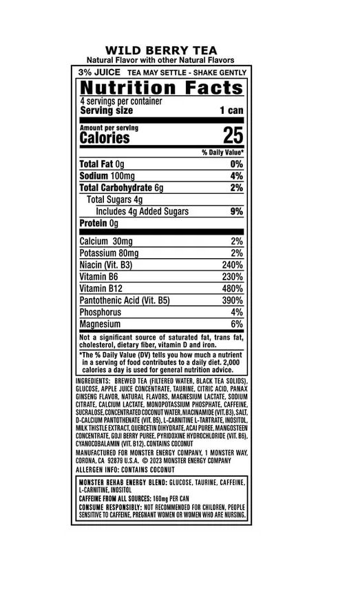 ОСВЕЖЕНИЕ + ВОССТАНОВЛЕНИЕ + ВОЗРОЖДЕНИЕ | Откройте Rehab Monster Wild Berry Tea и позвольте электролитам творить чудеса, даруя жизнь и насыщая организм влагой. 25 калорий, негазированный, насыщен витаминами и растительными компонентами, которые обеспечивают улучшенную гидратацию, помогая вам снизить утомляемость и повысить концентрацию