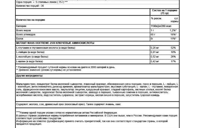 Каждая порция, смешанная с 2 стаканами молока с содержанием жира 1% обеспечивает 1270 калорий, 46 граммов протеина, 255 граммов углеводов и 7.5 граммов полезных жиров. Продукт разработан из полноценных продуктов питания и щедро содержат аминокислоты разветвленных цепочек, незаменимые аминокислоты, глютамин и другие аминокислоты, которые необходимы для роста и восстановления мышц.