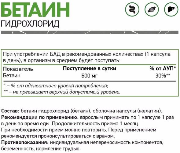 Бетаин обладает гепатопротекторным свойством, способствует выведению из организма токсических веществ, очищает сосуды, улучшает функции печени, благотворно воздействует на метаболизм в целом.