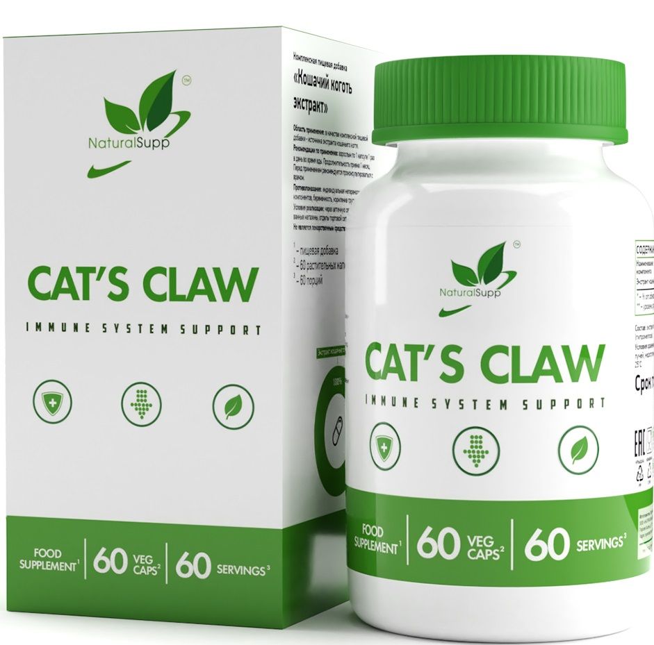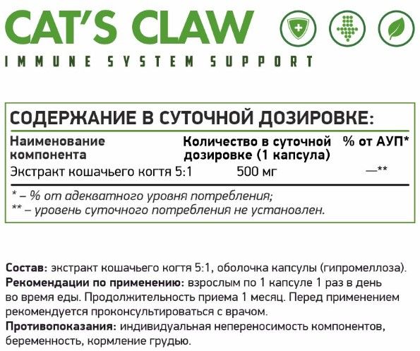 В состав комплексной пищевой добавки для поддержания иммунитета входит экстракт кошачьего когтя. Это специально выделенные активные компоненты из коры лианы ункарии, которые содержат алкалоиды, ринхофиллин, полифенолы и растительные стероиды. Составляющие обладают противовоспалительными и противовирусными свойствами, способствуют предотвращению образования тромбов, ускорению работы Т-лимфоцитов, обеспечивающих удаление чужеродных клеток в организме.