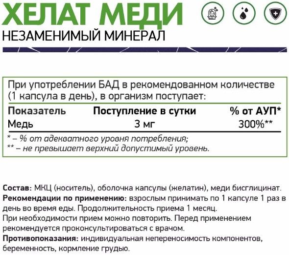 Приём хелатной меди от NaturalSupp поддерживает нормальное функционирование органов и систем организма. Мощное антиоксидантное действие с нейтрализацией свободных радикалов. Защищает клетки от преждевременного старения. Ускоряет заживление ран и улучшает внешний вид кожи. Стимулирует синтез коллагена и белка. Принимает участие в укреплении иммунной системы.