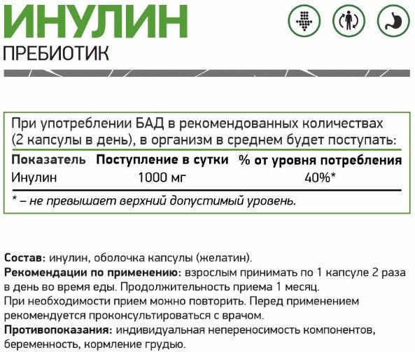 За счет выработки бактерий он питает микрофлору кишечника, оказывает благоприятное воздействие на работу ЖКТ. С его помощью нормализуются обменные процессы, липидный и углеводный метаболизм, ускоряется процесс сжигания жира. Благодаря иммуномодулирующим свойствам инулина повышается иммунитет и улучшается общее состояние организма. Снижает уровень сахара в крови, уменьшает чувство голода, способствует очищению пищеварительного тракта и снижению веса при ожирении.