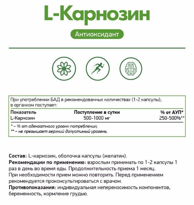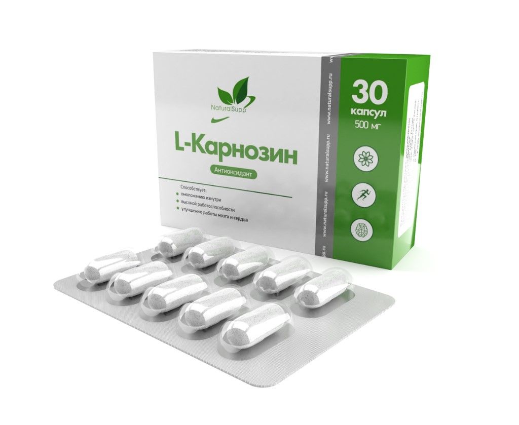 В составе L-Carnosine от NaturalSupp содержится карнозин. На 1 порцию приходится 500 мг данного соединения. Карнозин естественным образом синтезируется в нашем теле. Основная его часть накапливается в мышцах и мозге. Во многих исследованиях было установлено, что карнозин обладает сильными антиоксидантными свойствами, т.е. он защищает клетки от оксидативного стресса и предупреждает тем самым формирование многих заболеваний. За счет своих антиоксидантных свойств карнозин помогает в борьбе со многими состояниями, обусловленными возрастными изменениями в теле. Сюда, к примеру, относят заболевания сердечно-сосудистой системы и болезнь Альцгеймера. Исследования говорят о том, что карнозин ускоряет заживление ран и ожогов и тем самым способствует улучшению внешнего вида кожи.