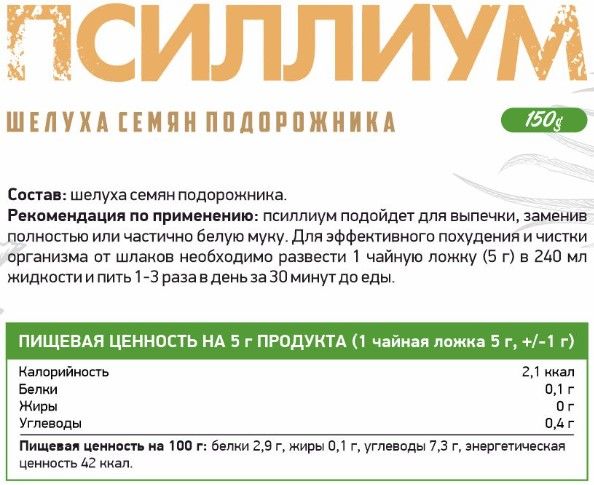 Псиллиум подойдет для выпечки, заменив полностью или частично белую муку. Для эффективного похудения и чистки организма от шлаков необходимо развести 1 чайную ложку (5 г) в 240 мл жидкости и пить 1-3 раза в день за 30 минут до еды.