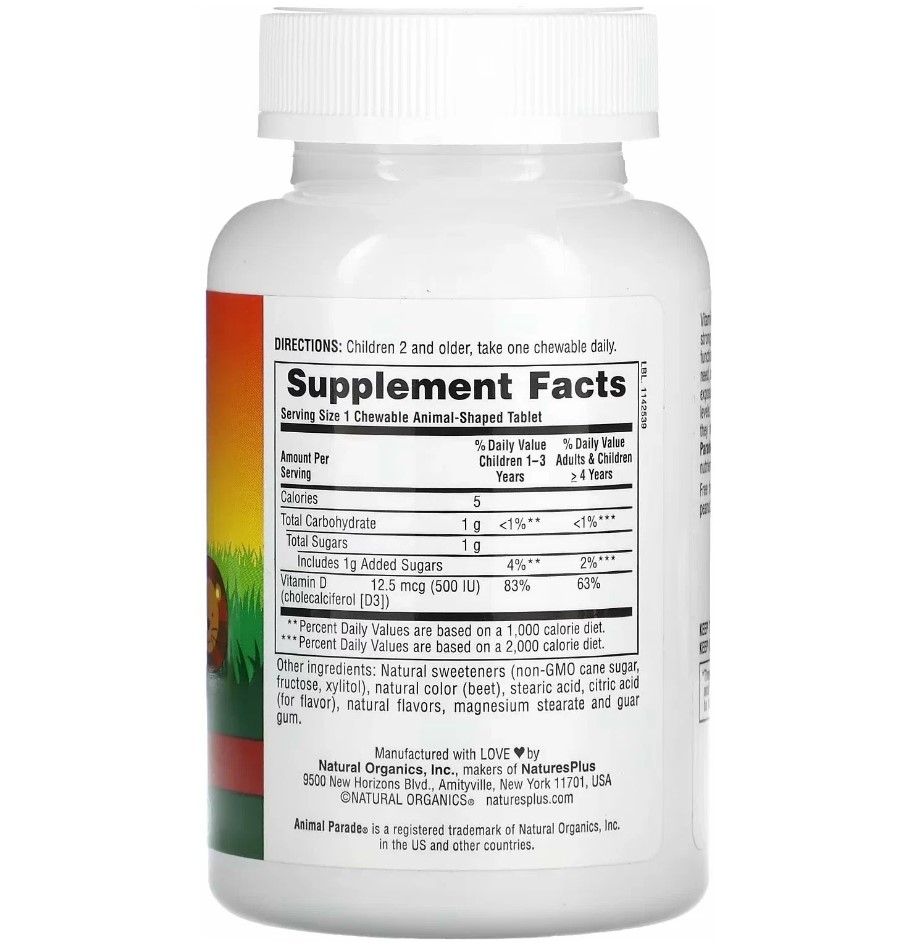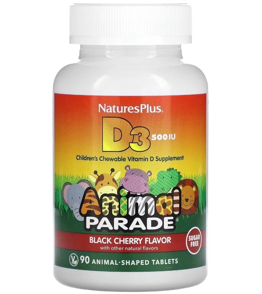 Детские жевательные таблетки Animal Parade с витамином D3 500 МЕ имеют приятный вкус натуральной черемухи и сделаны в форме животных, которых так любят дети.