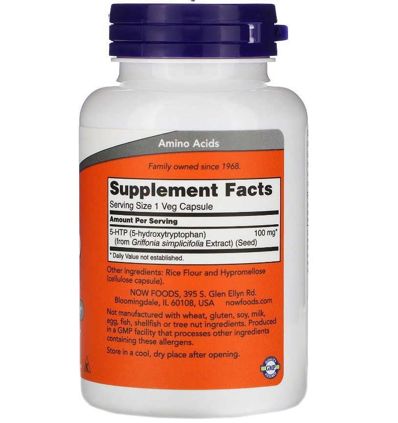 NOW 5-HTP 100 mg – спортивная добавка на основе комплекса аминокислот. Продукт относится к категории природных антидепрессантов. Содержащаяся в компонентном составе аминокислота триптофан является мощнейшим стимулятором, провоцирующим выработку серотонина и дофамина.Добавка не вызывает привыкания. Благодаря применению триптофана удается оптимизировать функционирование клеток головного мозга, улучшить запоминание, укрепить сердечную мышцу, урегулировать температурные показатели тела, нормализовать сон и общее эмоциональное состояние.