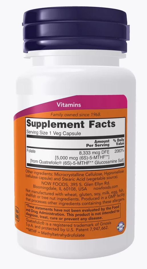 NOW Foods Methyl Folate Метил Фолат 5000 мкг- это высококачественный источник коэнзим витамина В9. Метилфолат Нау фудс обладает максимально высокой биологической доступностью и соответственно эффективностью. В отличие от обычной фолиевой кислоты, нау фудс метилфолат, витамины группы В как показали исследования, преодолевает гематоэнцефалический барьер и поддерживает здоровье нервной системы. Эффекты от применения витаминного комплекса NOW Foods Methyl Folate 5000 mcg: поддержание здоровья организма на клеточном уровне, поддержка нервной и сердечно-сосудистой систем, повышение иммунитета, повышение работоспособности, снижение раздражительности и уровня стресса.