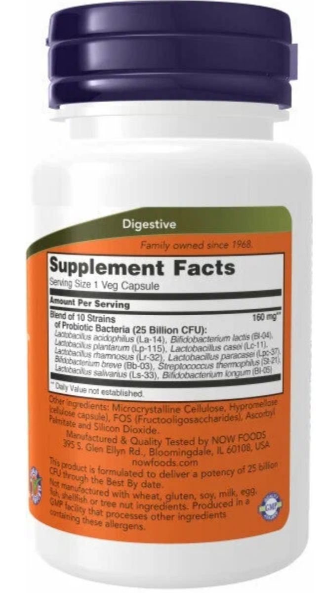 Проблемы с пищеварением боятся Probiotic-10 25 Billion от NOW Стресс, неправильное питание, лекарства, вредные привычки и даже плохая экология может стать причиной нарушения кишечной микрофлоры. Диетами или йогуртами с этой проблемой не справиться. Чтобы вернуть пищеварение в норму, понадобится купить насыщенную добавку Probiotic-10 25 Billion. Эффекты пробиотика: приводит в норму работу пищеварительной системы; способствует восстановлению кишечной микрофлоры; стимулирует обмен веществ и улучшает усвоение пищи; препятствует размножению патогенной микрофлоры в кишечнике; ускоряет выведение токсических и канцерогенных веществ; поддерживает работу иммунной системы. Озабочены работой пищеварения? В таком случае рекомендуем также включить в рацион натуральную добавку Psyllium Husk Caps, от американской компании NOW. Что особенного в Probiotic-10 25 Billion от NOW FOODS? Probiotic-10 – это сбалансированный комплекс для поддержания здоровой кишечной микрофлоры. Вас ожидает 25 млрд КОЕ в каждой капсуле и десять проверенных пробиотических штаммов. Никакой лактозы, глютена, сои или ГМО. Продукт безопасен и начинает действовать с первых дней использования. Как правильно принимать Probiotic-10: для профилактики – по 1 порции 1-2 раза в день до еды; во время приема антибиотиков – по 1 порции за 60-120 минут до приема лекарств. Порция – 1 капсула. Принимайте добавку натощак. Курс приема от 2 до 8 недель. Другие ингредиенты: Целлюлозный порошок, целлюлоза (капсула), FOS (фруктоолигосахариды), аскорбилпальмитат и диоксид кремния.